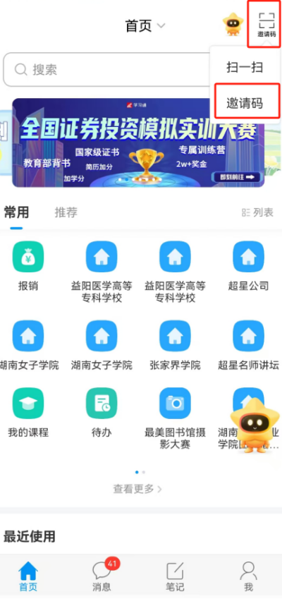 1、在学习通首页右上角【邀请码】,输入邀请码【10737]进入单位页面。