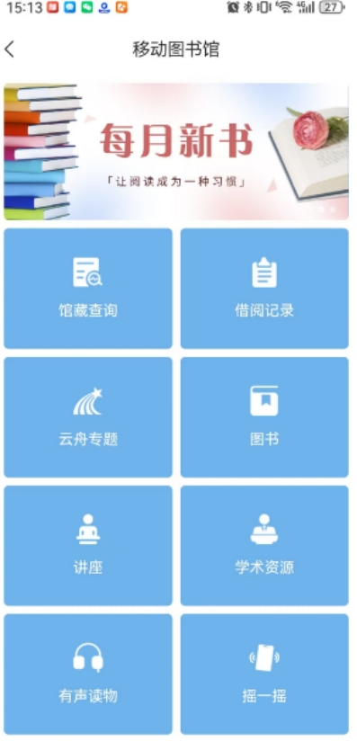 在首页-移动图书馆应用点击可进入移动图书馆页面,其中移动图书馆下的各模块需绑定借阅证号后即可使用,,如馆藏查询、借阅信息、图书、期刊、公开课、视频、报纸、有声读物、摇一摇等