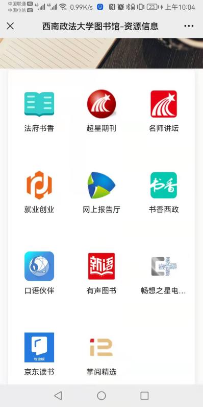 或者关注西南政法大学图书馆微信公众号,依次点击“资源信息”→“更多”→“掌阅精选”→即可开始阅读